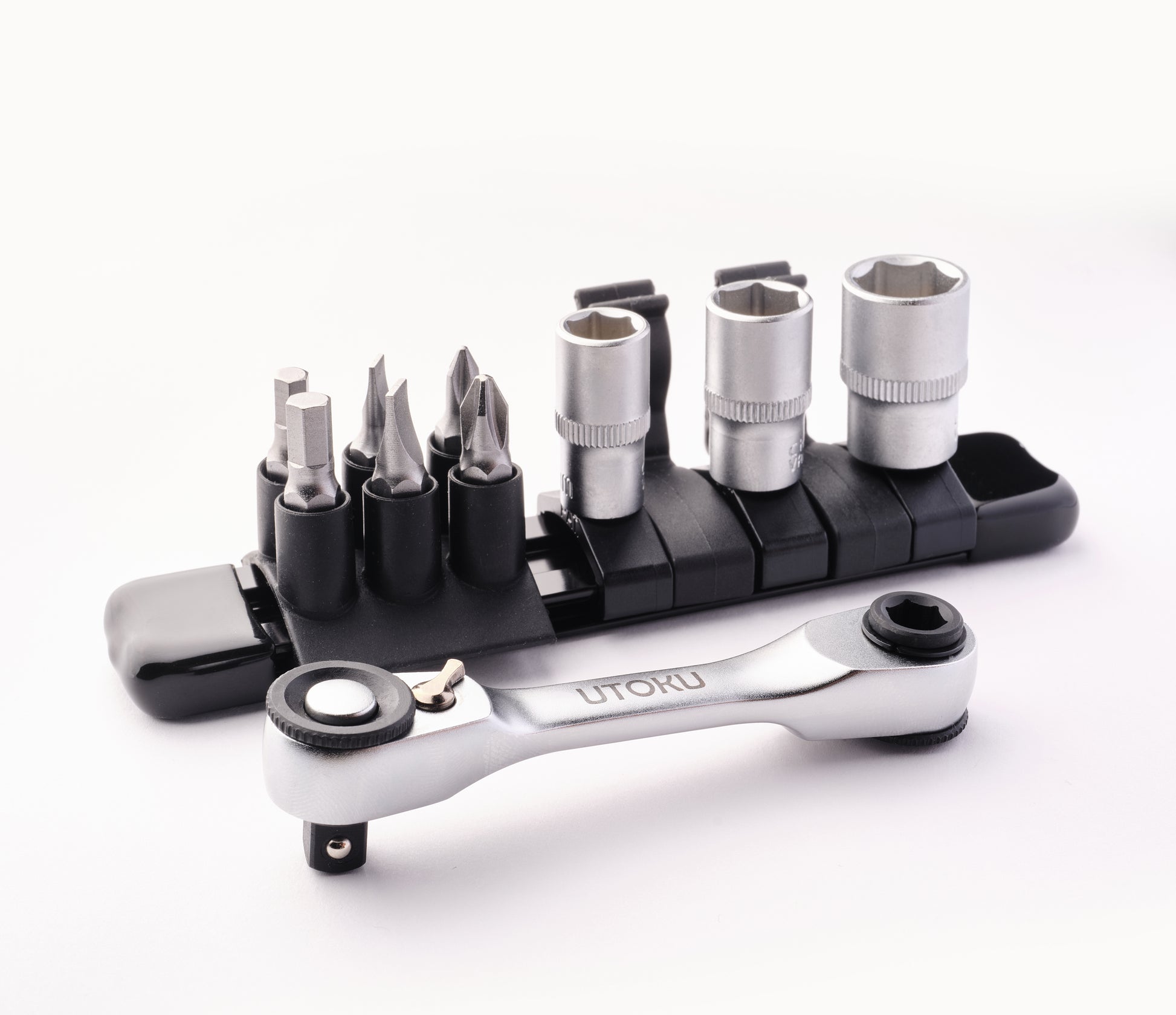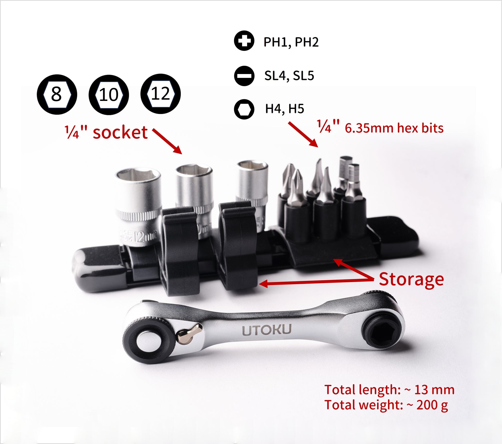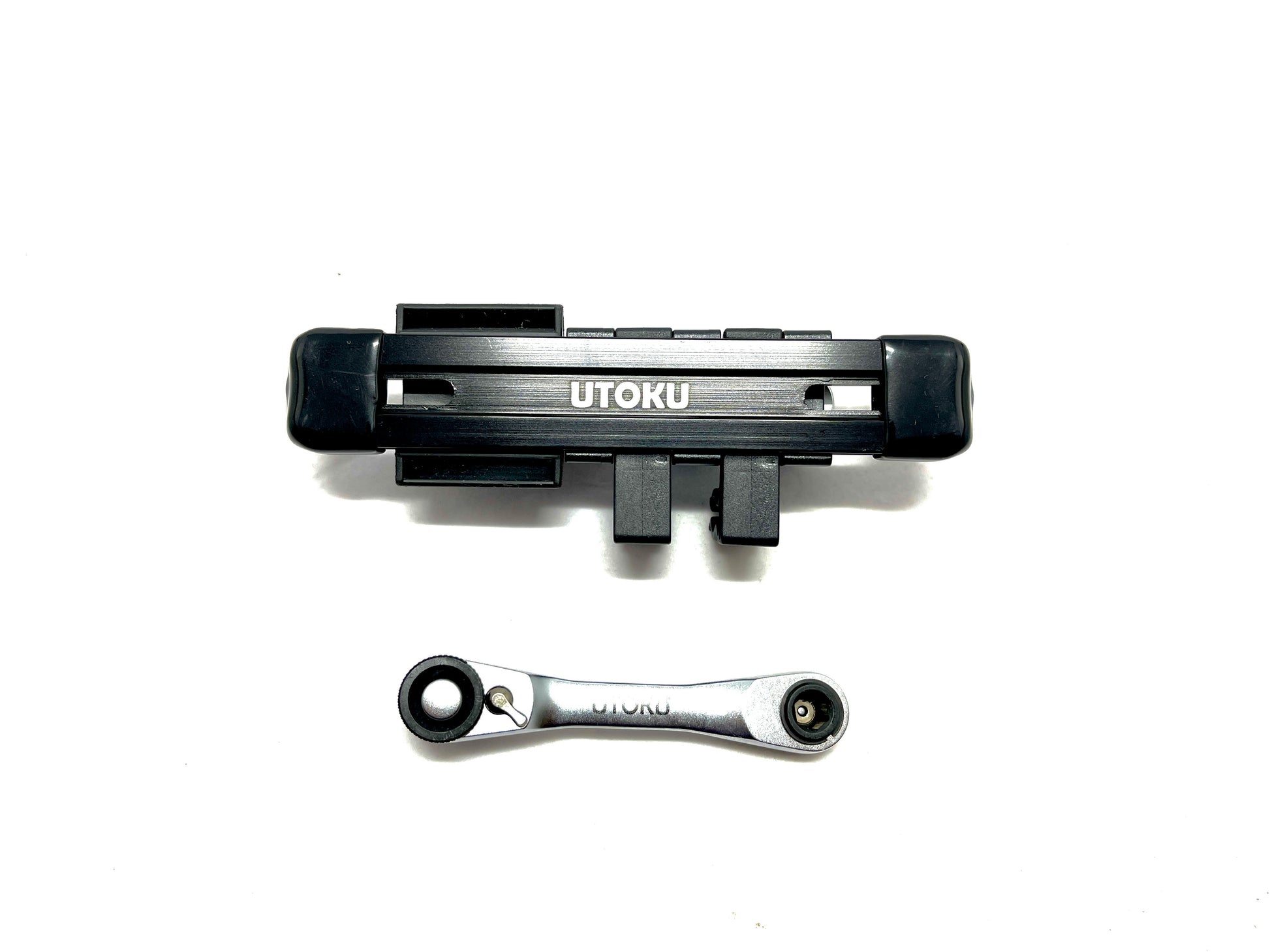 •Rubberized 6 bit holder, ratchet holder clips, and ball detent socket holders on an aluminum Utoku branded rail.