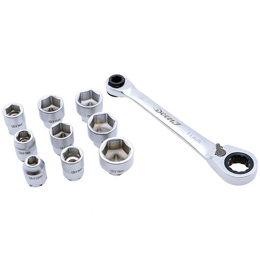 • The double ended ratchet wrench has a 72 tooth 11 mm reversible end with a locking ring to lock in the super low profile 1/4 in. Drive sockets. 18 mm total thickness with each socket.