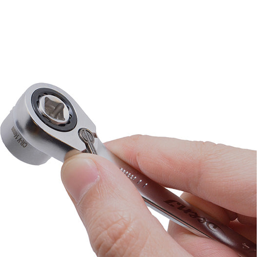 • The 4 1/2 in. length double ended ratchet wrench also has a 52 tooth reversible bit ratchet end with a speed disc backing. The back of the bit ratchet has a hole to allow the half cut bits to be as low profile as possible into the bit ratchet head. 18 mm total thickness with each bit. The hole also allows for quick eject of the bits.