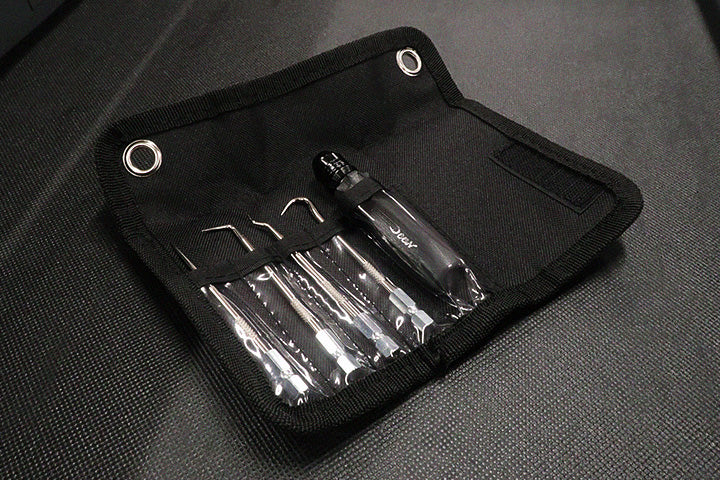 • 4 Piece interchangeable tip pick set with quick collar bit holding handle and pouch.